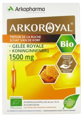 Arkopharma Arko Royal Treasure of the Hive Royal Jelly 1500mg Bio 20 Phials is a food supplement based on Royal Jelly, a substance secreted by the bees to exclusively feed one of their own who will become queen.