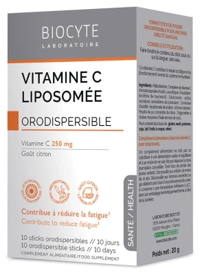 Biocyte Longevity Vitamin C Liposomed 10 Sticks is a food supplement in form of orodispersible powder to be taken directly without water. It is based on Vitamin C, with sweeteners.