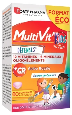 Forté Pharma MultiVit’ Kids Defences 60 Chewable Tablets is a dietary supplement specially formulated to recharge and rebalance the body and strengthen the immune defenses of children from 4 years old.