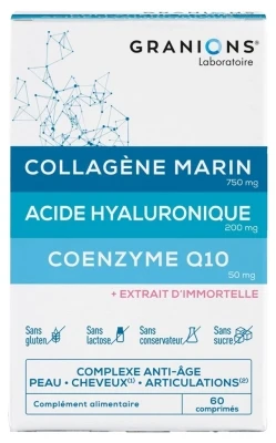 Granions Marine Collagen Hyaluronic Acid Coenzyme Q10 60 Tablets is a food supplement based on active ingredients with anti-ageing virtues and to maintain the conjonctive tissues.