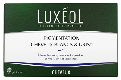 Luxéol Pigmentation White & Gray 30 Capsules is a food supplement for hair pigmentation based on Blackcurrant, Pomegranate, L-Tyrosine, Copper, Zinc and vitamins.