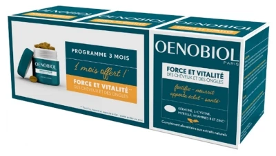 Oenobiol Hair and Nail Strength and Vitality 3 x 60 Capsules in which 60 Capsules Offered is a food supplement with natural extracts offering a triple action: