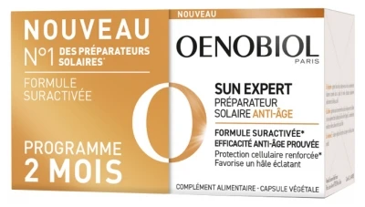Oenobiol Sun Expert Sun Preparer Anti-Aging 2 x 30 Capsules is a food supplement offering a preparation of the skin before the solar exposure thanks to an antioxydant cellular protection, a brilliant tan, firmness and flexibility.