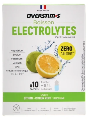Overstims Electrolytes Drink Lemon – Green Lemon 10 Sachets is a powdered drink mix enriched with vitamins and minerals, which contains less than 4 kcal per 100 ml. It is specifically formulated to provide optimal hydration to your short duration workouts (less than 60 minutes).