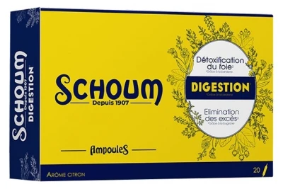Schoum Digestionn 20 Phials is a food supplement based on plants: Fumitory, Bugrane, Burdock and Chicory.