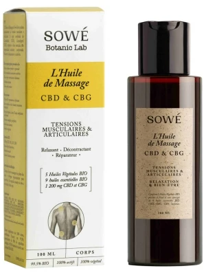 Sowé Massage Oil 100 ml is a body massage oil that rapidly relieves and soothes muscle and joint tension. The combined action of cannabidiol (CBD), cannabigerol (CBG), terpenes and essential oils is said to have proven anti-inflammatory properties. It promotes relaxation and comfort.