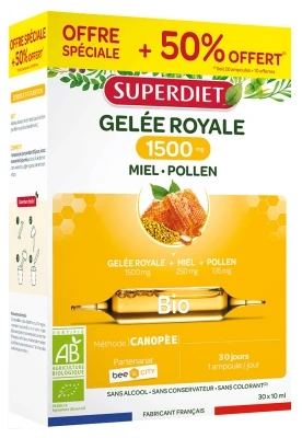 Superdiet Organic Royal Jelly 1500mg Honey Pollen 20 Phials + 10 Phials Free is a food supplement based on organic Royal Jelly, honey and pollen to resist to winter aggressions.