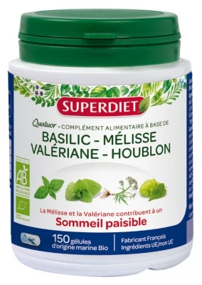 Superdiet Quatuor Organic Lemon Balm Peaceful Sleep 150 Capsules is a food supplement combining 4 plants:
