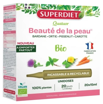 Superdiet Quatuor Organic Skin Beauty 20 Unidoses is a food complement containing burdock, nettle, dandelion and carrot.